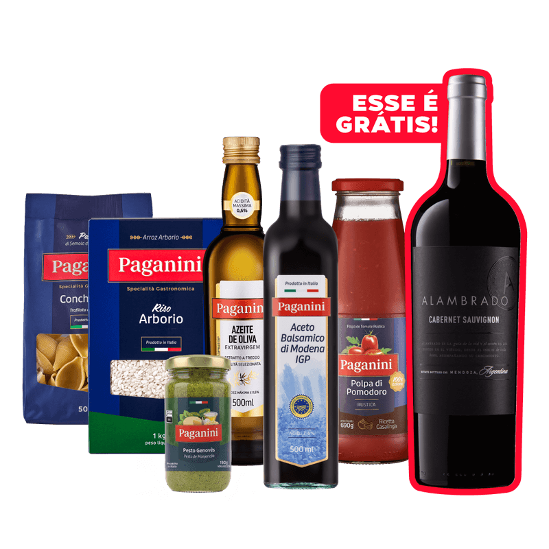 A Cesta Paganini + Vinho Alambrado Grátis reúne ingredientes essenciais da culinária italiana, pensados para transformar suas receitas. Azeite extravirgem, aceto balsâmico, arroz arborio, polpa rústica de tomate, pesto alla genovese e a clássica massa conchiglioni garantem pratos cheios de sabor e tradição. Para completar, o kit ainda traz de brinde o Vinho Alambrado Etiqueta Negra Cabernet Sauvignon, da Argentina. Aproveite!