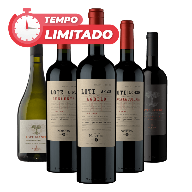 O Kit 5 Lotes de Mendoza (Ícones da Norton) reúne cinco vinhos excepcionais que expressam o melhor dos terroirs mendocinos. São rótulos produzidos a partir de vinhas velhas e parcelas únicas, com diferentes estilos e altitudes. O Lote Agrelo, La Colonia, Lunlunta e Negro apresentam interpretações distintas da uva Malbec, variando entre potência e elegância, enquanto o Lote Blanco Grüner Veltliner traz frescor com sua acidez vibrante e perfil mineral. Um kit para os verdadeiros apreciadores de grandes vinhos argentinos. Aproveite!