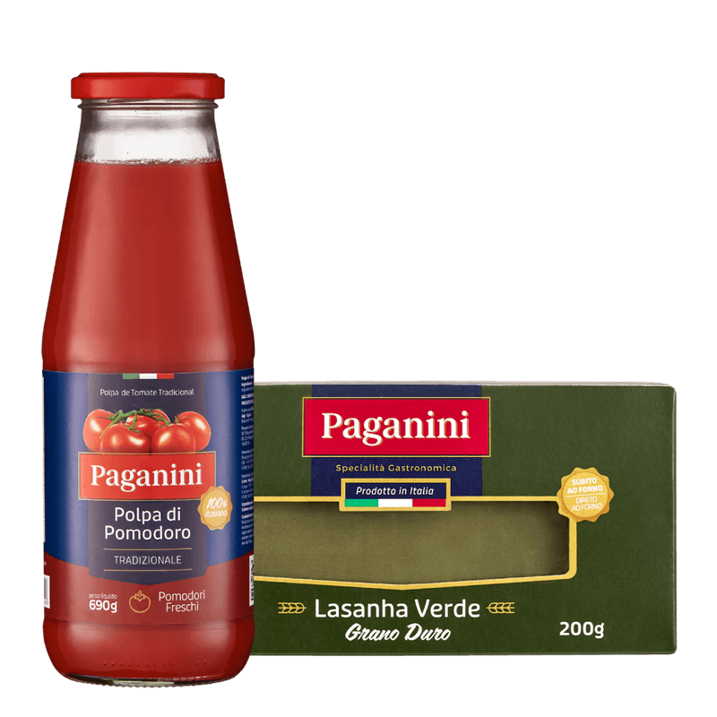 O Kit Lasagna Verde + Polpa de Tomate Paganini reúne dois ingredientes essenciais para uma lasanha de qualidade. A Lasagna Verde Paganini, elaborada com sêmola de grano duro e espinafre, vai direto ao forno e entrega sabor e praticidade. Já a Polpa de Tomate Tradicional Paganini, produzida na Campânia com tomates selecionados, garante frescor e intensidade para o molho perfeito. Em poucos passos, você monta um prato digno de uma trattoria!