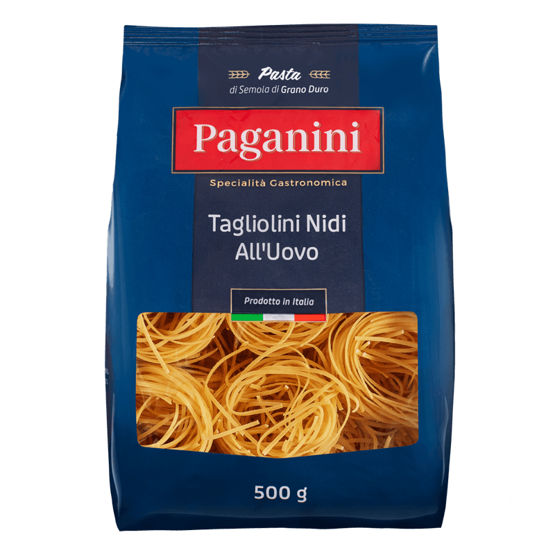 A Massa Tagliolini Nidi com Ovos Paganini 500 g é elaborada na Itália com sêmola de grano duro de alta qualidade e leva 4 ovos frescos por quilo de trigo. Em formato de ninhos (nidi), o tagliolini é uma massa longa e fina, semelhante ao espaguete, porém mais delicada. Cozinha rapidamente e é ideal para molhos e acompanhamentos suaves, como manteiga e ervas, queijos, trufas. Conheça!